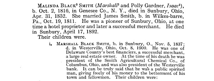 I believe both men were descendants of James A. Smith of Pennsylvania, a Berkshire Township, Delaware County, merchant/dry goods grocer. James was first married to Melinda Black and had two sons, Marshall and George W. Levi R. Smith was the son of James A. and his second wife, Elizabeth or "Betsy" and was born January 19, 1858 in Sunbury.